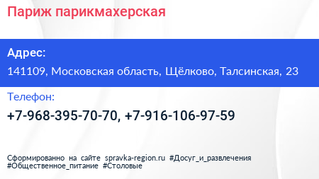 Париж, парикмахерская по адресу 141109, Московская область, Щёлково, Талсинская, 23 в дальнейшем Организация, размещена в следующих категориях: