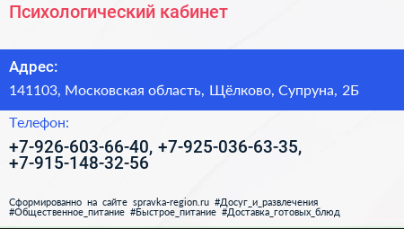 Психологический кабинет по адресу 141103, Московская область, Щёлково, Супруна, 2Б в дальнейшем Организация, размещена в следующих категориях: