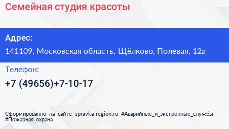 Семейная студия красоты по адресу 141109, Московская область, Щёлково, Полевая, 12а в дальнейшем Организация, размещена в следующих категориях: