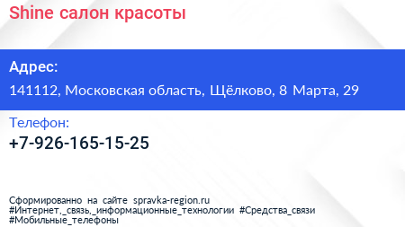 Shine, салон красоты по адресу 141112, Московская область, Щёлково, 8 Марта, 29 в дальнейшем Организация, размещена в следующих категориях:
