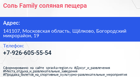 Соль Family, соляная пещера по адресу 141107, Московская область, Щёлково, Богородский микрорайон, 19 в дальнейшем Организация, размещена в следующих категориях: