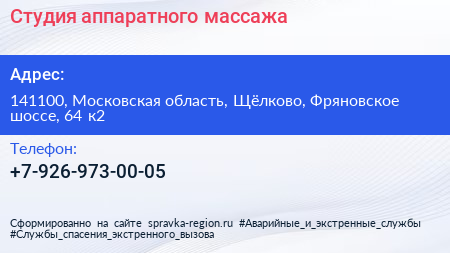 Студия аппаратного массажа по адресу 141100, Московская область, Щёлково, Фряновское шоссе, 64 к2 в дальнейшем Организация, размещена в следующих категориях: