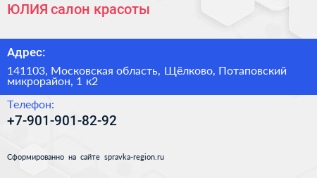 ЮЛИЯ, салон красоты по адресу 141103, Московская область, Щёлково, Потаповский микрорайон, 1 к2 в дальнейшем Организация, размещена в следующих категориях: