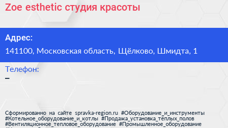 Zoe esthetic, студия красоты по адресу 141100, Московская область, Щёлково, Шмидта, 1 в дальнейшем Организация, размещена в следующих категориях: