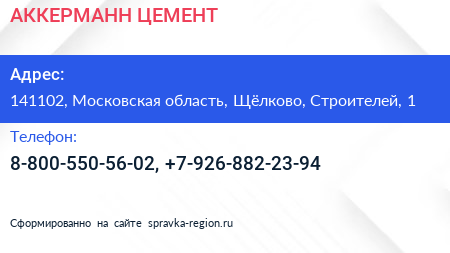 АККЕРМАНН ЦЕМЕНТ по адресу 141102, Московская область, Щёлково, Строителей, 1 в дальнейшем Организация, размещена в следующих категориях: