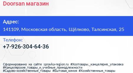 Doorsan, магазин по адресу 141109, Московская область, Щёлково, Талсинская, 25 в дальнейшем Организация, размещена в следующих категориях: