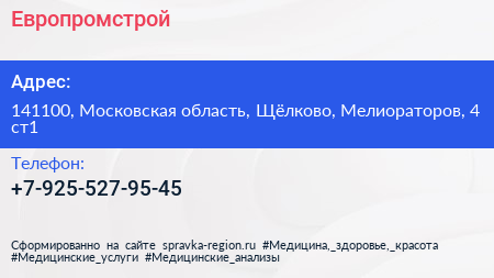 Европромстрой по адресу 141100, Московская область, Щёлково, Мелиораторов, 4 ст1 в дальнейшем Организация, размещена в следующих категориях: