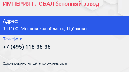 ИМПЕРИЯ ГЛОБАЛ, бетонный завод по адресу 141100, Московская область, Щёлково, в дальнейшем Организация, размещена в следующих категориях: