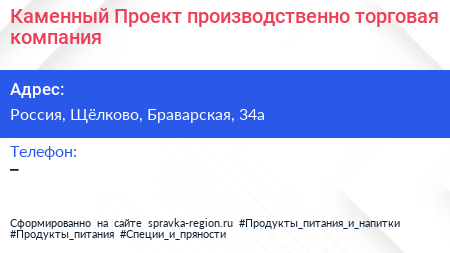 Каменный Проект, производственно-торговая компания по адресу 30, Браварская улица, Богородский микрорайон, Хомутово, Набережная, городской округ Щёлково, Московская область, Центральный федеральный округ, 141100, Россия в дальнейшем Организация, размещена в следующих категориях: