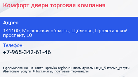 Комфорт двери, торговая компания по адресу 141100, Московская область, Щёлково, Пролетарский проспект, 10 в дальнейшем Организация, размещена в следующих категориях: