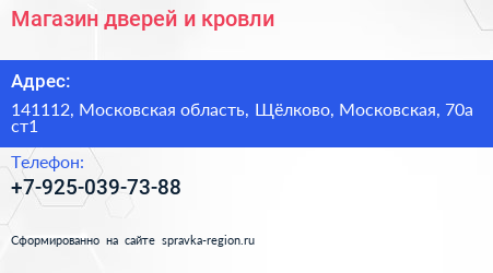 Магазин дверей и кровли по адресу 141112, Московская область, Щёлково, Московская, 70а ст1 в дальнейшем Организация, размещена в следующих категориях: