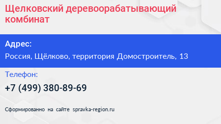 Щелковский деревоорабатывающий комбинат по адресу 1-я Соколовская улица, Соколовская промзона, Соколовский, Загорянский, городской округ Щёлково, Московская область, Центральный федеральный округ, 141180, Россия в дальнейшем Организация, размещена в следующих категориях: