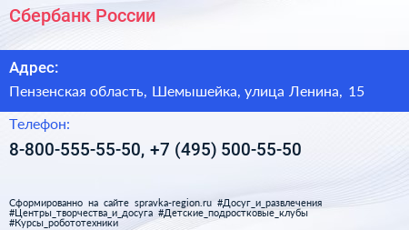 Сбербанк России по адресу Пензенская область, Шемышейка, улица Ленина, 15 в дальнейшем Организация, размещена в следующих категориях: