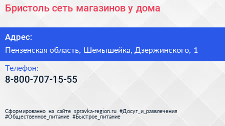 Бристоль, сеть магазинов у дома по адресу Пензенская область, Шемышейка, Дзержинского, 1 в дальнейшем Организация, размещена в следующих категориях: