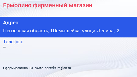 Ермолино, фирменный магазин по адресу Пензенская область, Шемышейка, улица Ленина, 2 в дальнейшем Организация, размещена в следующих категориях: