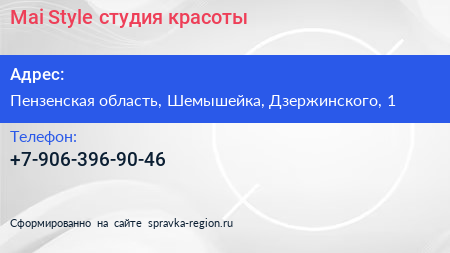 Mai Style, студия красоты по адресу Пензенская область, Шемышейка, Дзержинского, 1 в дальнейшем Организация, размещена в следующих категориях: