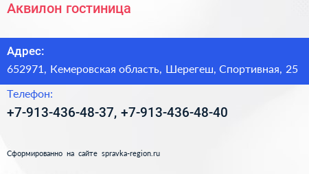 Аквилон, гостиница по адресу 652971, Кемеровская область, Шерегеш, Спортивная, 25 в дальнейшем Организация, размещена в следующих категориях:
