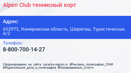 Alpen Club, теннисный корт по адресу 652971, Кемеровская область, Шерегеш, Туристическая, 6/2 в дальнейшем Организация, размещена в следующих категориях: