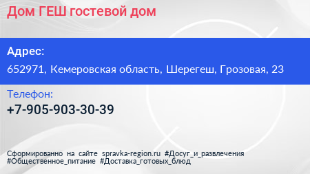 Дом ГЕШ, гостевой дом по адресу 652971, Кемеровская область, Шерегеш, Грозовая, 23 в дальнейшем Организация, размещена в следующих категориях: