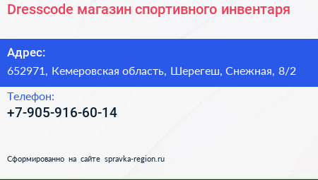Dresscode, магазин спортивного инвентаря по адресу 652971, Кемеровская область, Шерегеш, Снежная, 8/2 в дальнейшем Организация, размещена в следующих категориях: