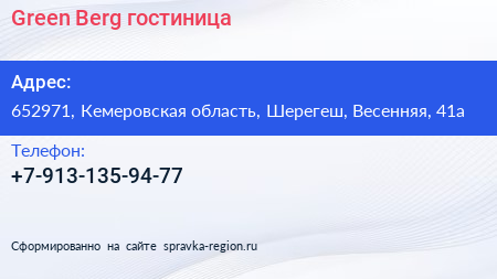 Green Berg, гостиница по адресу 652971, Кемеровская область, Шерегеш, Весенняя, 41а в дальнейшем Организация, размещена в следующих категориях: