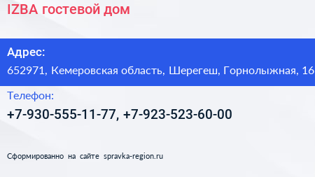 IZBA, гостевой дом по адресу 652971, Кемеровская область, Шерегеш, Горнолыжная, 16 в дальнейшем Организация, размещена в следующих категориях:
