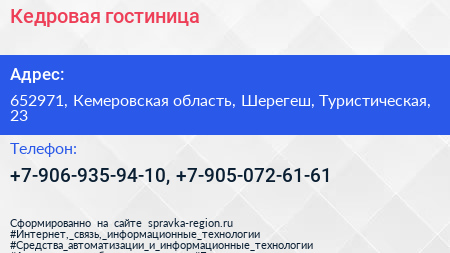 Кедровая, гостиница по адресу 652971, Кемеровская область, Шерегеш, Туристическая, 23 в дальнейшем Организация, размещена в следующих категориях: