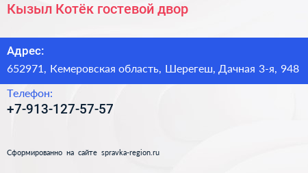 Кызыл-Котёк, гостевой двор по адресу 652971, Кемеровская область, Шерегеш, Дачная 3-я, 948 в дальнейшем Организация, размещена в следующих категориях: