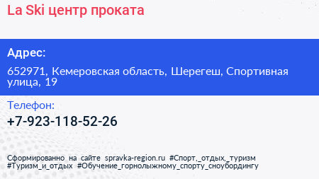 La Ski, центр проката по адресу 652971, Кемеровская область, Шерегеш, Спортивная улица, 19 в дальнейшем Организация, размещена в следующих категориях: