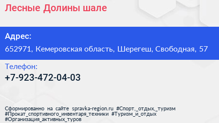 Лесные Долины, шале по адресу 652971, Кемеровская область, Шерегеш, Свободная, 57 в дальнейшем Организация, размещена в следующих категориях: