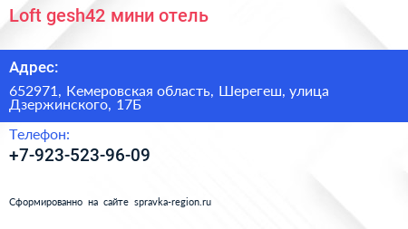 Loft-gesh42, мини-отель по адресу 652971, Кемеровская область, Шерегеш, улица Дзержинского, 17Б в дальнейшем Организация, размещена в следующих категориях: