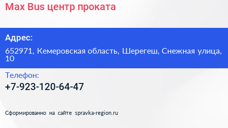 Max-Bus, центр проката по адресу 652971, Кемеровская область, Шерегеш, Снежная улица, 10 в дальнейшем Организация, размещена в следующих категориях: