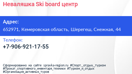 Неваляшка Ski-board, центр по адресу 652971, Кемеровская область, Шерегеш, Снежная, 44 в дальнейшем Организация, размещена в следующих категориях: