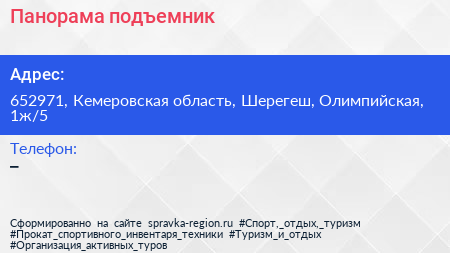 Панорама, подъемник по адресу 652971, Кемеровская область, Шерегеш, Олимпийская, 1ж/5 в дальнейшем Организация, размещена в следующих категориях: