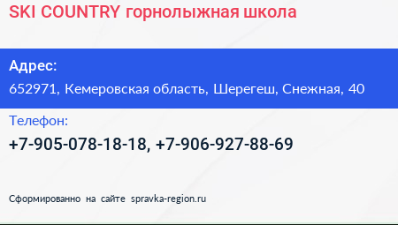 SKI COUNTRY, горнолыжная школа по адресу 652971, Кемеровская область, Шерегеш, Снежная, 40 в дальнейшем Организация, размещена в следующих категориях:
