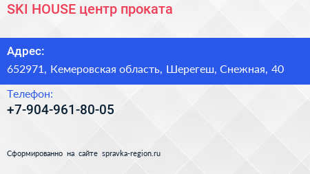 SKI HOUSE, центр проката по адресу 652971, Кемеровская область, Шерегеш, Снежная, 40 в дальнейшем Организация, размещена в следующих категориях: