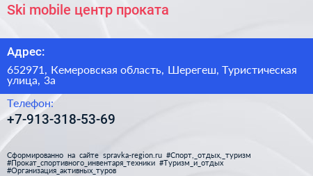Ski mobile, центр проката по адресу 652971, Кемеровская область, Шерегеш, Туристическая улица, 3а в дальнейшем Организация, размещена в следующих категориях: