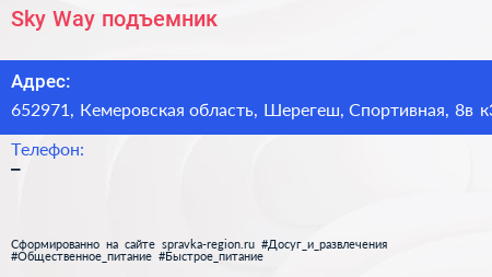 Sky Way, подъемник по адресу 652971, Кемеровская область, Шерегеш, Спортивная, 8в к3 в дальнейшем Организация, размещена в следующих категориях: