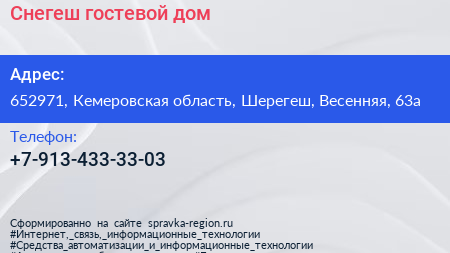 Снегеш, гостевой дом по адресу 652971, Кемеровская область, Шерегеш, Весенняя, 63а в дальнейшем Организация, размещена в следующих категориях: