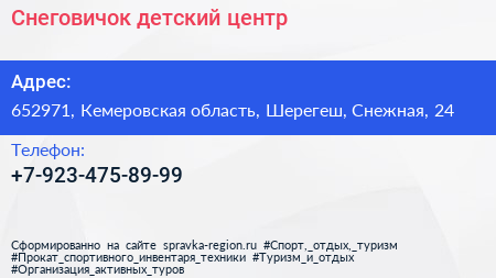 Снеговичок, детский центр по адресу 652971, Кемеровская область, Шерегеш, Снежная, 24 в дальнейшем Организация, размещена в следующих категориях: