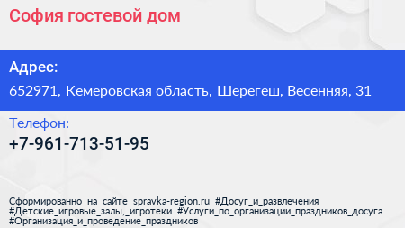София, гостевой дом по адресу 652971, Кемеровская область, Шерегеш, Весенняя, 31 в дальнейшем Организация, размещена в следующих категориях:
