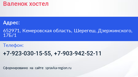 Валенок, хостел по адресу 652971, Кемеровская область, Шерегеш, Дзержинского, 17Б/1 в дальнейшем Организация, размещена в следующих категориях: