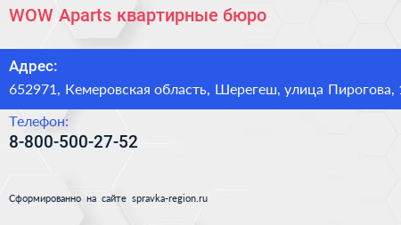 WOW.Aparts, квартирные бюро по адресу 652971, Кемеровская область, Шерегеш, улица Пирогова, 1 в дальнейшем Организация, размещена в следующих категориях: