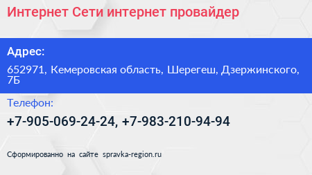 Интернет Сети, интернет-провайдер по адресу 652971, Кемеровская область, Шерегеш, Дзержинского, 7Б в дальнейшем Организация, размещена в следующих категориях: