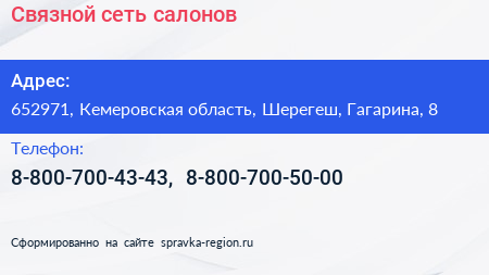 Связной, сеть салонов по адресу 652971, Кемеровская область, Шерегеш, Гагарина, 8 в дальнейшем Организация, размещена в следующих категориях: