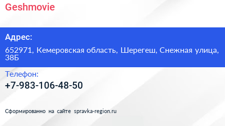 Geshmovie по адресу 652971, Кемеровская область, Шерегеш, Снежная улица, 38Б в дальнейшем Организация, размещена в следующих категориях: