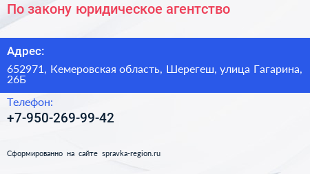 По закону, юридическое агентство по адресу 652971, Кемеровская область, Шерегеш, улица Гагарина, 26Б в дальнейшем Организация, размещена в следующих категориях: