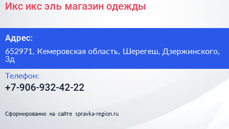 Икс икс эль, магазин одежды по адресу 652971, Кемеровская область, Шерегеш, Дзержинского, 3д в дальнейшем Организация, размещена в следующих категориях: