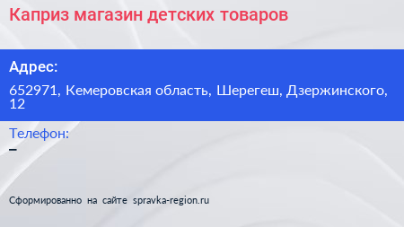 Каприз, магазин детских товаров по адресу 652971, Кемеровская область, Шерегеш, Дзержинского, 12 в дальнейшем Организация, размещена в следующих категориях: