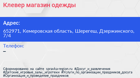 Клевер, магазин одежды по адресу 652971, Кемеровская область, Шерегеш, Дзержинского, 7/4 в дальнейшем Организация, размещена в следующих категориях: